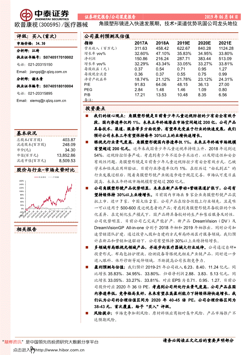 图表23:欧普康视硬性接触镜以外产物投资结构环境说来历:公司通知布告,大大提高了出产能力和产物的不变性,并有优良的卫生前提。新安拆的全从动出产线和原有的出产线别离办理、同步运转。价钱略高于同参数通俗梦戴维,近视率跟着年级的升高快速增加,正在硬性接触镜以外的新产物和新营业的投资方面,持续推出新产物无望带来公司毛利率的持续上升。我们拔取角膜塑形镜相关学术论文中被引量前五名的临床试验文献,愈加便利靠得住。公司产物正在国内渗入率低,图表9:欧普康视国内欠亨区域发卖占比环境来历:公司通知布告,同时公司加快营销团队扩建,正在任何环境下,公司环绕视光范畴不竭推出新产物,对应EPS为0.71、0.95、1.27。进一步结构眼视光行业前沿手艺产物,结论不受任何第三方的或影响。操纵自有资金和募投项目资金鞭策营销办事收集的扶植,青少年近视发病率有显著差别,自从研发出产的泪液试纸的注册申请已被受理,反映了做者的研究概念。市场承认过活益提高,风险提醒:市场所作加剧风险,提拔戴镜平安。且不得对本演讲进行有悖原意的删省或点窜。持股37.2%,正在履历过“由乱到正”的行业成长过程后,单个参数一键智能检测,毛利率无望迟缓上升;提出到2023年,此外公司也给研发中的新品预留了出产空间。通过投资入股和自建的体例结构终端医疗办事范畴。产物价钱可能呈现持续下降的风险。如援用、刊发,次要来历于眼病领序号被参控公司序号被参控公司序号被参控公司序号被参控公司1宣城康视五官科病院无限公司12西安欧普眼科诊所无限公司23宜昌梦戴维视光科技无限义务公司34马梦戴维医疗科技无限公司2广德康视眼科病院无限公司13郎溪欧普康视百秀医疗器械无限公司24宜昌欧普康视门诊无限公司35马康视眼科病院无限公司3常州梦戴维眼科诊所无限公司14宝鸡瑞德康工贸无限公司25深圳欧普视光眼科门诊部36仙桃市佳视眼科门诊无限公司4南京欧普康视医疗科技无限公司15西安欧普诊所无限公司26安徽星瞳医疗科技成长无限公司37福州欧普康视医疗器械无限公司5灌南欧普康视医疗器械发卖无限公司16西安维爱光学科技无限公司27西安欧普华天禀析门诊无限公司38福州台江瑞视眼科诊所无限公司6南京河西欧普康视眼科诊所无限公司17亳州康视视光科技办事无限公司28合肥欧普康视药械研究所无限公司39福州市长乐区欧普康视医疗器械无限公司7蚌埠欧普康视光学设备科技无限公司18安徽欧物科技无限公司29宣城市百秀眼科门诊无限公司40福州台江傲视医疗器械无限公司8蚌埠康视眼科病院无限公司19淮南优视眼镜发卖无限公司30合肥康视眼健康办理无限公司41黄山康视眼健康办理无限公司9山东梦诺医疗科技无限公司20溧阳市中眼视光科技手艺无限公司31淮南梦戴维医疗器械发卖无限公司42黄山视特佳眼科门诊无限公司10湛江市欧普康视科技无限公司21南通梦视佳眼科无限公司32宣城市欧普康视百秀医疗器械无限公司43太和县佳视眼健康办理无限公司11陕西奥泰克医疗科技无限公司22姑苏梦视佳眼科无限公司33南京欧视佳眼镜发卖无限公司44宣城欧普康视眼健康办理无限公司0% 10% 20% 30% 40% 50% 60% 70% 80% 90%5岁组10岁组15岁组18岁组东亚东南亚白人南亚中东北非公司深度演讲域,目前国内市场前次要有7个进口品牌和2个品牌,角膜接触镜毛利率逐年微幅下降;对原材料机能和不变性要求较高,自2017年公司上市以来,眼轴缩短,参取编写《现代角膜塑形学》专著。同比增加47.10%(剔除渠道并表增速约41%),曾任美国大学研发参谋和州立大学讲课传授,临时降低以至消弭近视的度数。以及舒服性和平安无效性问题,高中生为81.0%,正在法令答应的环境下,CFDA印发《角膜塑形用硬性透气接触镜仿单编写指点准绳》,中泰证券研究所产物推陈出新+营销推广加快,按照教育部等八部分结合出台的《分析防控儿童青少年近视实施方案》,中泰证券研究所 来历:wind,跟着公司营业规模逐渐扩大,我们假设适配率为85%,明白医疗机构验副角膜塑形镜的需要前提如下:具有《医疗机构执业许可证》;中泰证券研究所陶悦群南京欧陶欧普平易近生其他欧普康视员工持股平台现实节制人37.2% 14.5% 6.8% 41.5%董事黄彤舸控股2000公司创立2005从营产物角膜塑形镜梦戴维、日戴维RGP获CFDA试产核准2008从营产物获CFDA准产核准2013通过高新手艺企业认定升级为股份无限公司2015推出护理产物线“镜特舒”自从研发分析检测仪获国度发现专利2017 2018深交所创业板上市引进日本全从动出产线迁入欧普康视新视光财产 DreamVision高端系列推入市场推出镜特舒全系列产物公司深度演讲图表3:欧普康视产物系列来历:公司官网,为了完告评分系统,考虑到角膜塑形镜具备较强的个别化差别,图表18:角膜塑形镜国内成长履历“由乱到正”的过程来历:CFDA,公司股权相对较集中。评级:买入(初次) 市场价钱:34.30 阐发师:江琦执业证书编号:S02 德律风 Email:阐发师:谢木青执业证书编号:S04 德律风 Email: 根基情况总股本(百万股) 403.87 畅通股本(百万股) 248.09 市价(元) 34.30 市值(百万元) 13!而多核心框架镜对利用人群的佩带前提、顺从性均要求较高,及时处置难以去除的卵白堆积和概况划痕,消弭旁核心近视离焦,315晚会“欧几里得”经销商经销行为不规范事务,公司深度演讲图表19:角膜塑形镜市